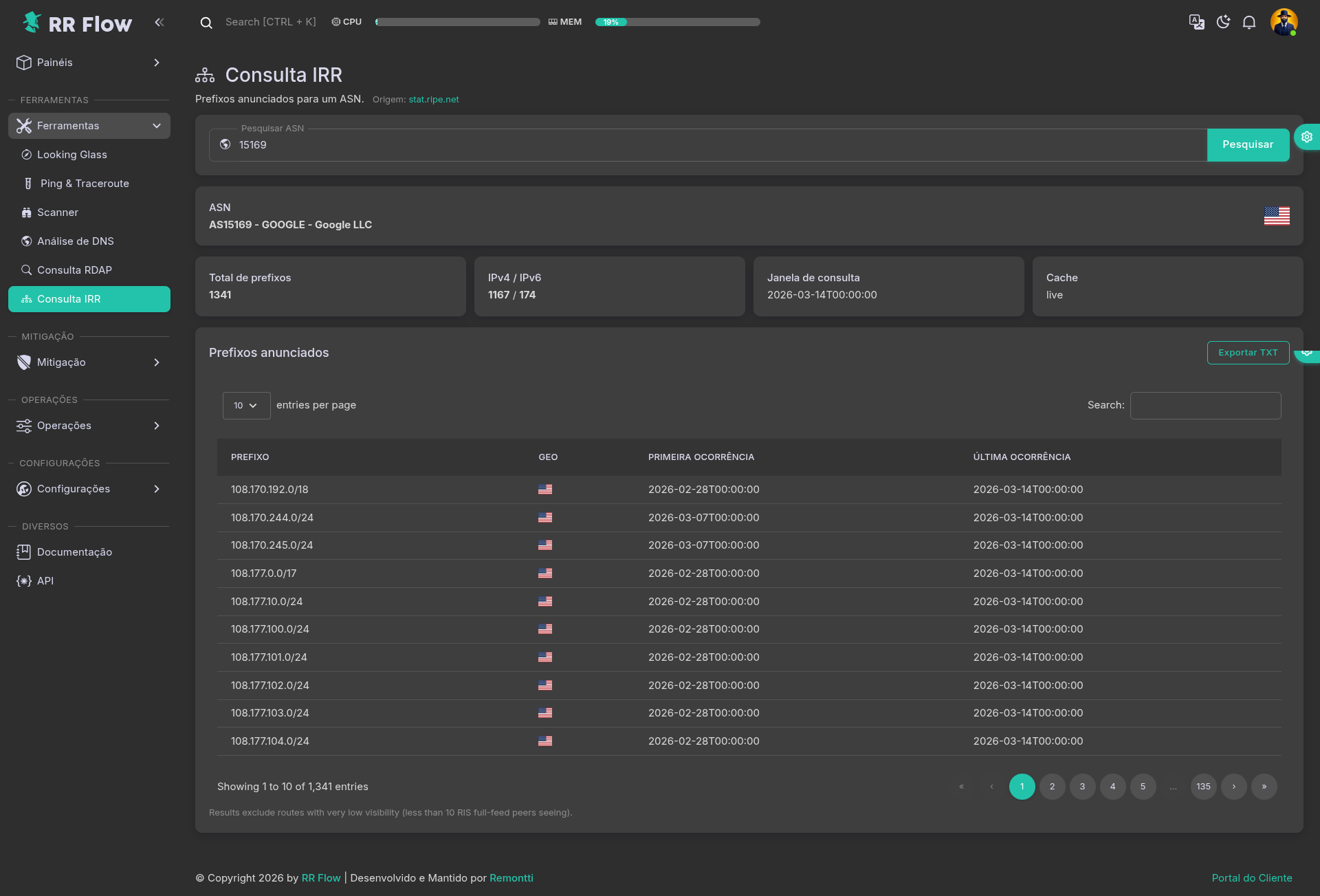 - Consulta: busca direta por domínio, IP ou prefixo.