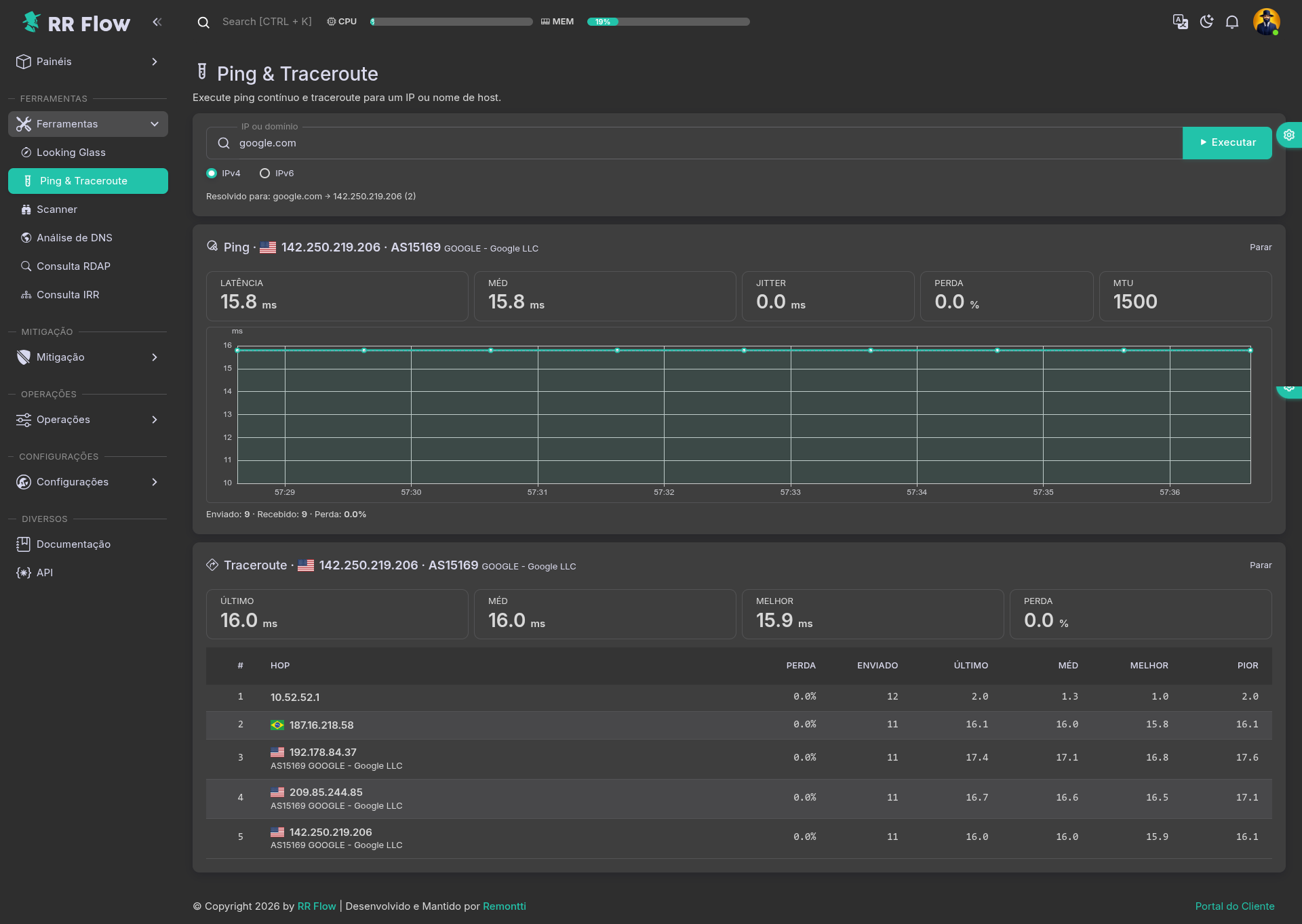 Executar ping contínuo e traceroute a partir do host do RR Flow para validar alcance, latência e caminho até um destino.
