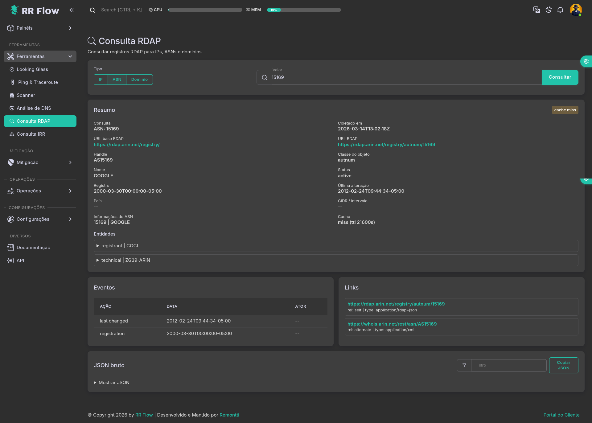 Consultar registros RDAP para IP, ASN ou domínio e revisar o objeto retornado em formato estruturado e JSON.